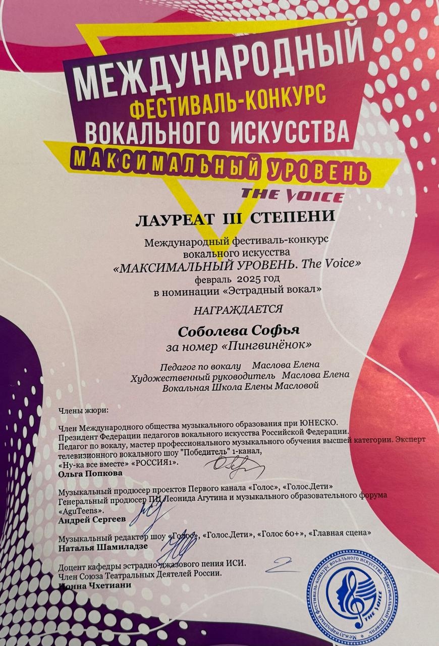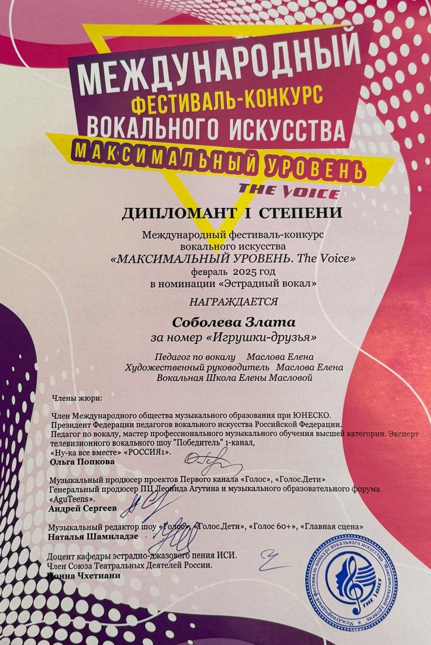 Участие в Международных конкурсах - это всегда интересно, но ответственно. Мы взяли на себя эту ответственность и полностью с ней справились, покорив и публику и жюри нашими авторскими песнями. А наши авторские песни - это особая гордость. Мы не просто исполнили чьи-то идеи, а донесли до мира собственные мысли, чувства и историю. Это делает победу еще более ценной и личной. Серьезное профессиональное жюри, находившееся в поисках самородков! Отсюда и высокие требования к участникам, как к уже ставшим на Великий путь Музыки людям, независимо от возрастной категории. И как итог, у нас Лауреат 3-й степени- Соболева София( 9 лет) и Дипломант 1-й степени Соболева Злата (7 лет).